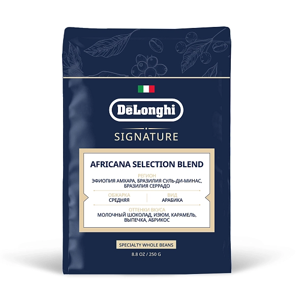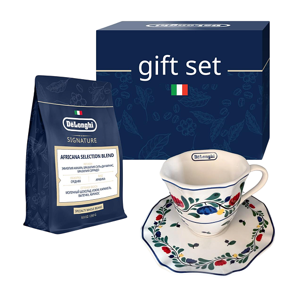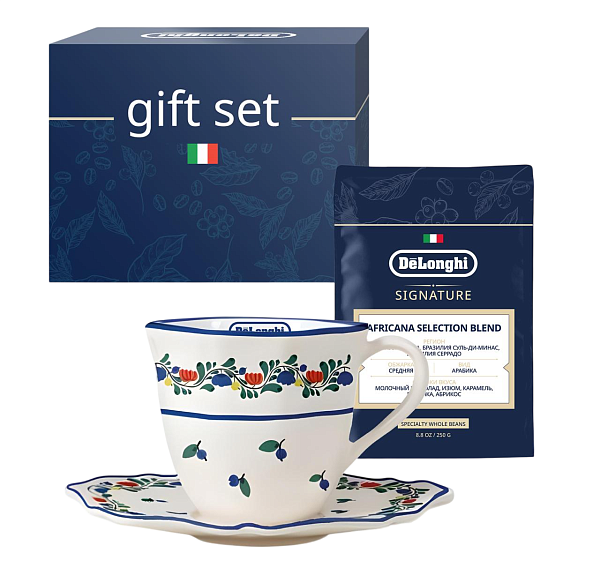 Набор объединяет ароматный кофе Africana (250 г) с насыщенным вкусом и фруктовыми оттенками и изящную керамическую пару — кружку 190 мл с блюдцем от партнёра «Дымов».